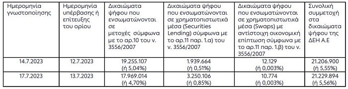 Ως εκ τούτου, η συνολική συμμετοχή της Goldman Sachs Group, Inc. στα δικαιώματα ψήφου της ΔΕΗ Α.Ε., ήτοι, το άθροισμα των δικαιωμάτων ψήφου που ενσωματώνονται σε μετοχές, των δικαιωμάτων ψήφου που προέρχονται από χρηματοπιστωτικά μέσα (Securities Lending) και των δικαιωμάτων ψήφου που προέρχονται από χρηματοπιστωτικά μέσα με αντίστοιχη οικονομική επίπτωση (Swaps) διαμορφώθηκε στις 13.7.2023 σε 21.229.894 (ή 5,56%) από 21.208.269 (ή 5,55%) στις 10.7.2023.