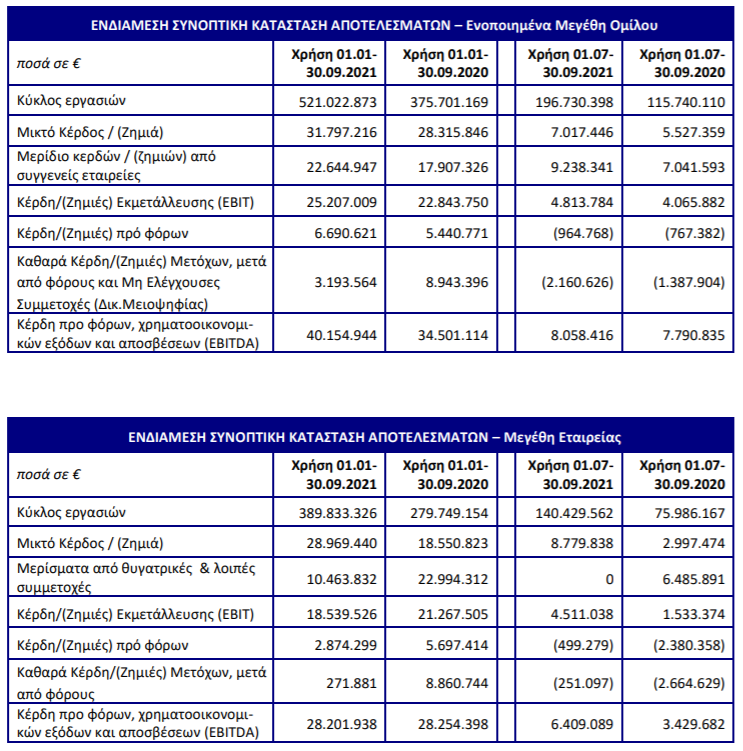 Αντίστοιχα, το λειτουργικό κέρδος προ φόρων και χρηματοοικονομικών εξόδων του Ομίλου στο εννεάμηνο του 2021 αυξήθηκε κατά 10,3% στα €25,2 εκ έναντι €22,8 εκ στην αντίστοιχη περίοδο του 2020, ενώ σε επίπεδο εταιρείας το κέρδος εκμετάλλευσης του εννεαμήνου 2021 έφτασε τα €18,5 εκ έναντι €21,3 εκ στο συγκρίσιμο εννεάμηνο του 2020.