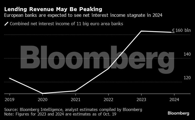 Βάσει της ανάλυσης του Bloomberg, τα καθαρά έσοδα από τόκους των μεγαλύτερων τραπεζών της Ευρώπης θα καταγράψουν αύξηση της τάξης του 19% σύμφωνα με τα αναμενόμενα εταιρικά δεδομένα του γ’ τριμήνου, στα 163 δισ. ευρώ.