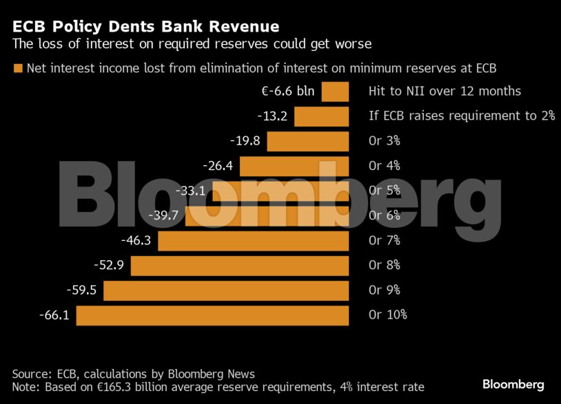 Την επιβολή αύξησης του υποχρεωτικού ελάχιστου ορίου αποθεματικών των τραπεζών στην κεντρική τράπεζα, κάτι το οποίο θα μπορούσε να οδηγήσει ακόμα και σε απώλεια εσόδων ύψους 66 δισ. ευρώ για τα ιδιωτικά χρηματοπιστωτικά ιδρύματα βάσει του δυσμενέστερου σεναρίου, επιθυμούν να επιβάλλουν αρκετά μέλη του διοικητικού συμβουλίου της Ευρωπαϊκής Κεντρικής Τράπεζας(ΕΚΤ), αναφέρει το Bloomberg.