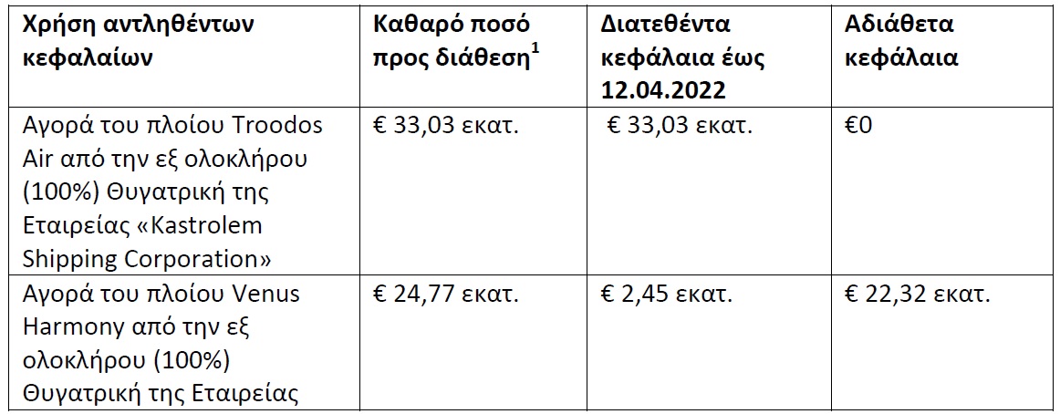 Σύμφωνα με τις δεσμεύσεις που διατυπώνονται στο σχετικό Ενημερωτικό Δελτίο που εγκρίθηκε από την Επιτροπή Κεφαλαιαγοράς και τις από 17.02.2022 και 11.4.2022 αποφάσεις του Διοικητικού Συμβουλίου της Εταιρείας, γνωστοποιείται ότι τα αντληθέντα κεφάλαια ποσού ύψους εκατό εκατομμυρίων ευρώ (€100.000.000), μείον ποσό ύψους €2.500.000 περίπου το οποίο αφορά δαπάνες έκδοσης, διατέθηκαν μέχρι την 12.04.2022 ως ακολούθως: