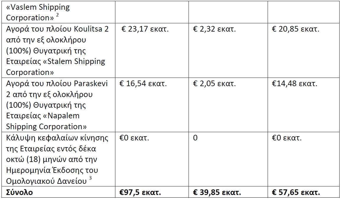 Συμφωνίας μεταξύ της εξ ολοκλήρου (100%) Θυγατρικής της Εταιρείας «Kastrolem Shipping Corporation» και της εξ ολοκλήρου (100%) Θυγατρικής της Εγγυήτριας «Shikokuexi Shipping Inc.». Το ως άνω ποσό διατέθηκε μέσω αύξησης του μετοχικού κεφαλαίου της θυγατρικής Εταιρείας «Kastrolem Shipping Corporation» που απέκτησε το πλοίο Troodos Air.