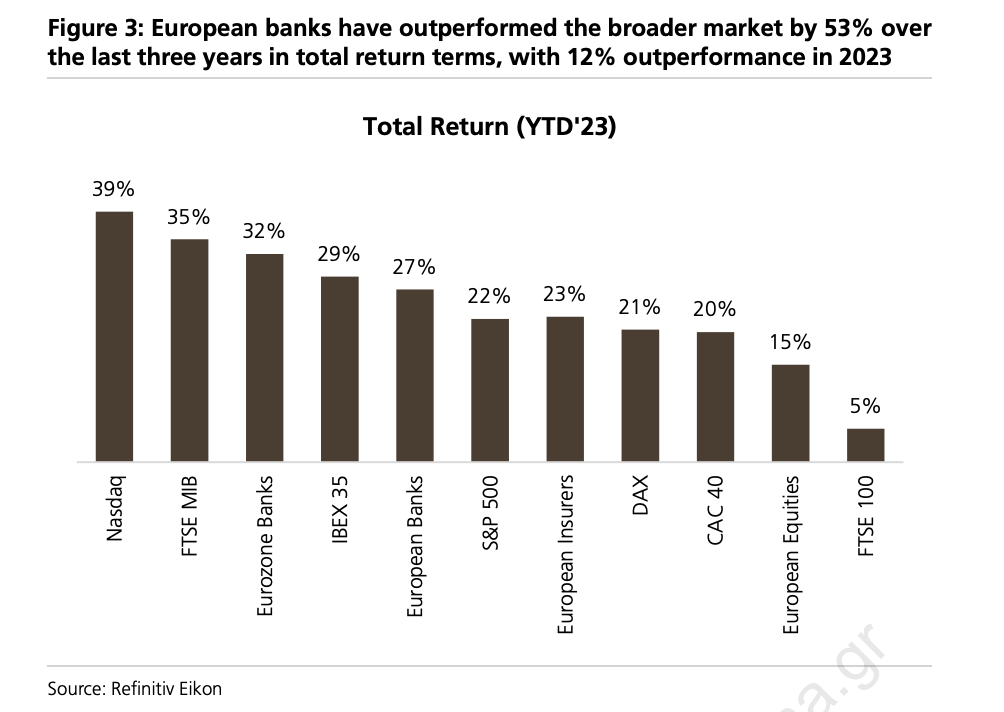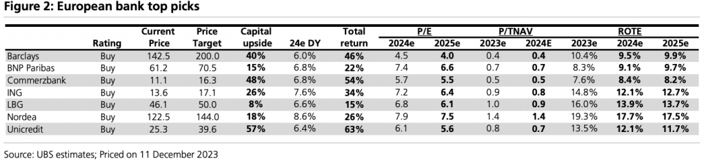Αν και οι τραπεζικές μετοχές στις ανεπτυγμένες αγορές της Ευρώπης κερδίζουν 82% από το τέλος του 2020 υπεραποδίδοντας 53% σε σχέση με την αγορά, οι τοπ επιλογές μετοχών από τον κλάδο (top picks) της UBS για το 2024 αφορούν τους τίτλους των Barclays, BNP Paribas, Commerzbank, ING, LBG, Nordea και UniCredit Bank με την τελευταία η οποία προσφάτως απέκτησε θέση και στην Alpha bank να παρουσιάζει και τα μεγαλύτερα περιθώρια ανόδου (+57%).